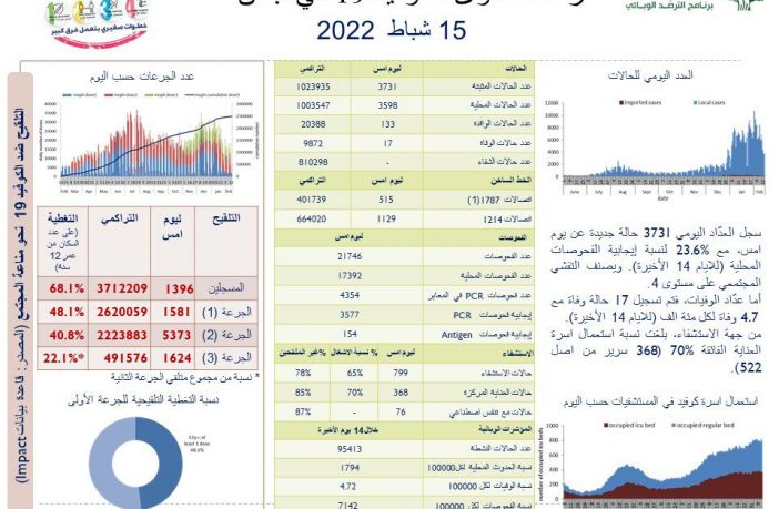 جائحة كورونا 3731 إصابة جديدة بفيروس كورونا و 17 حالة وفاة By AF فبراير 15, 2022 لا توجد تعليقات 3731 إصابة جديدة بفيروس كورونا و 17 حالة وفاة كورونا لبنان