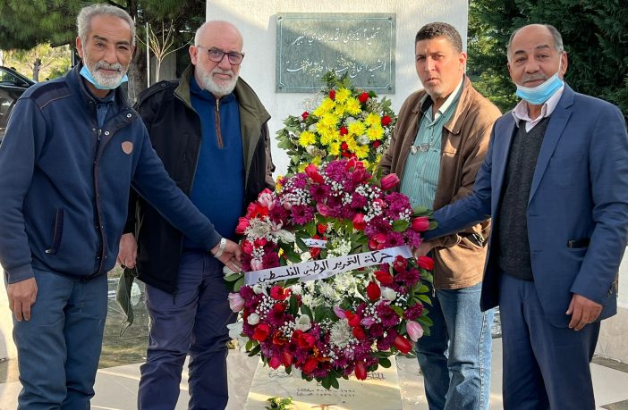 بداية قام اللواء توفيق عبدالله والوفد المرافق له، بتلاوة سورة المباركة الفاتحة عن أرواح شهداء لبنان وفلسطين، ومن ثم وضعوا إكليلاً من الزهور بإسم حركة “فتح” على النصب التذكاري للشهيد الحاج عماد مغنية.