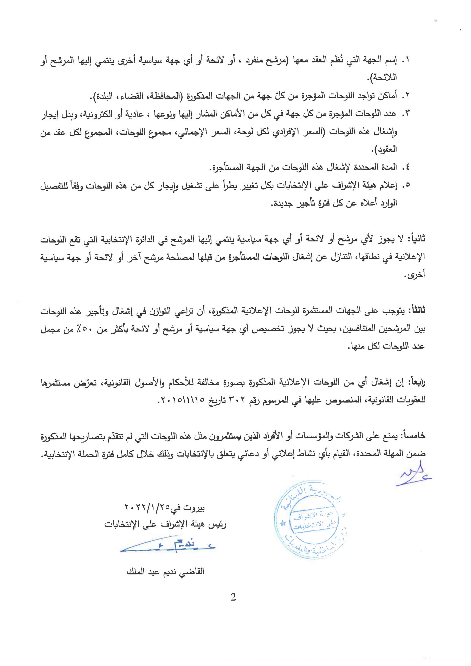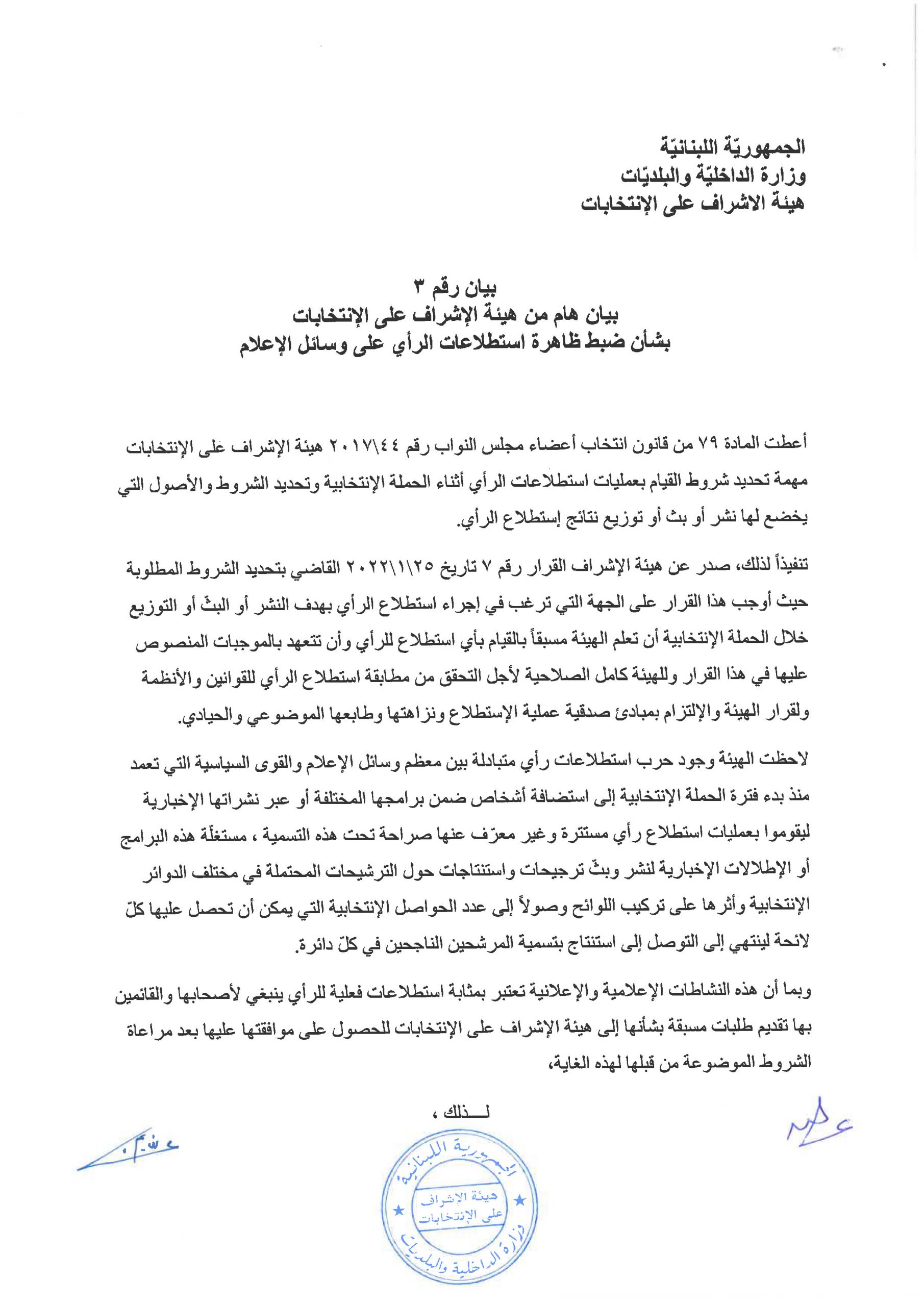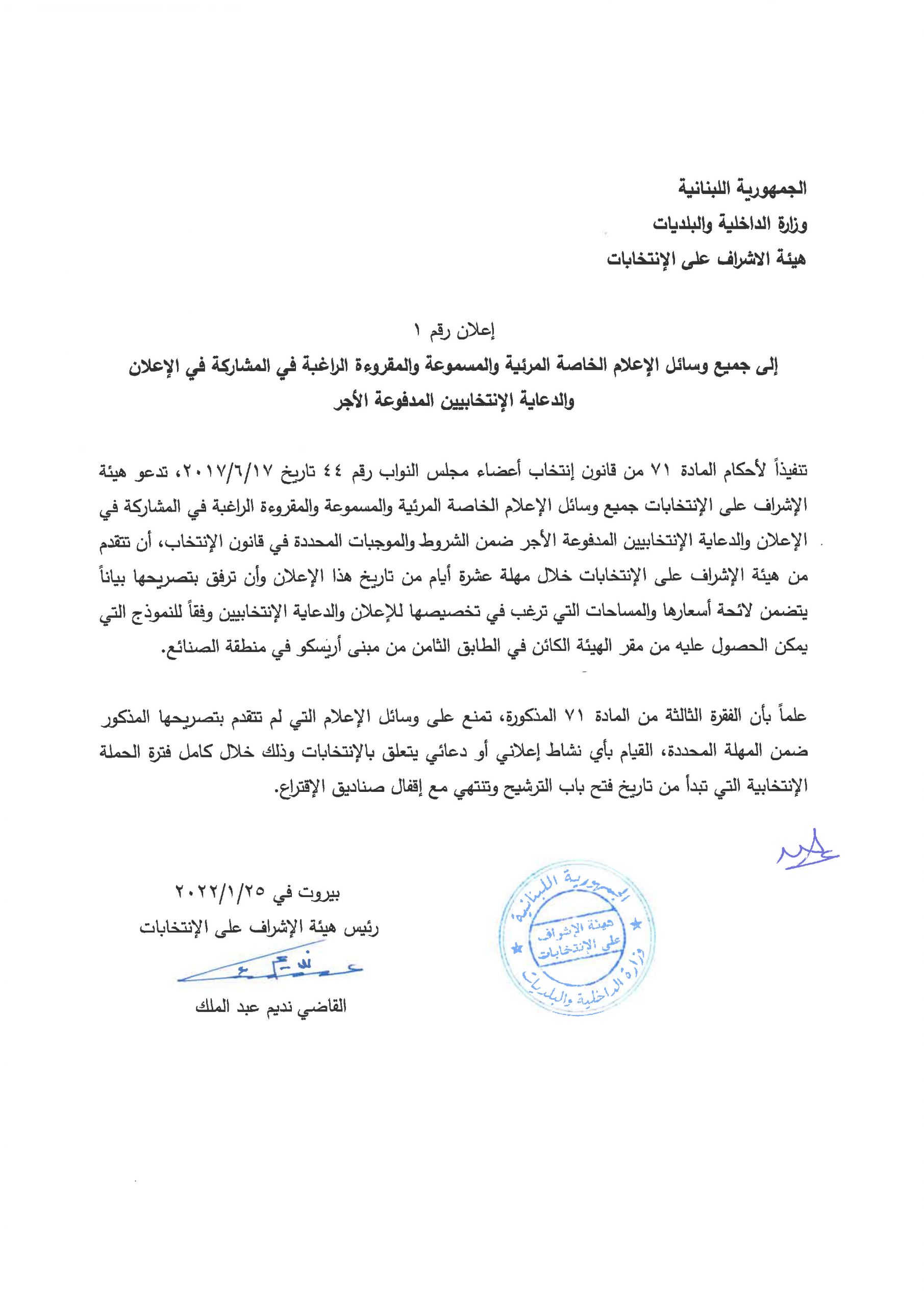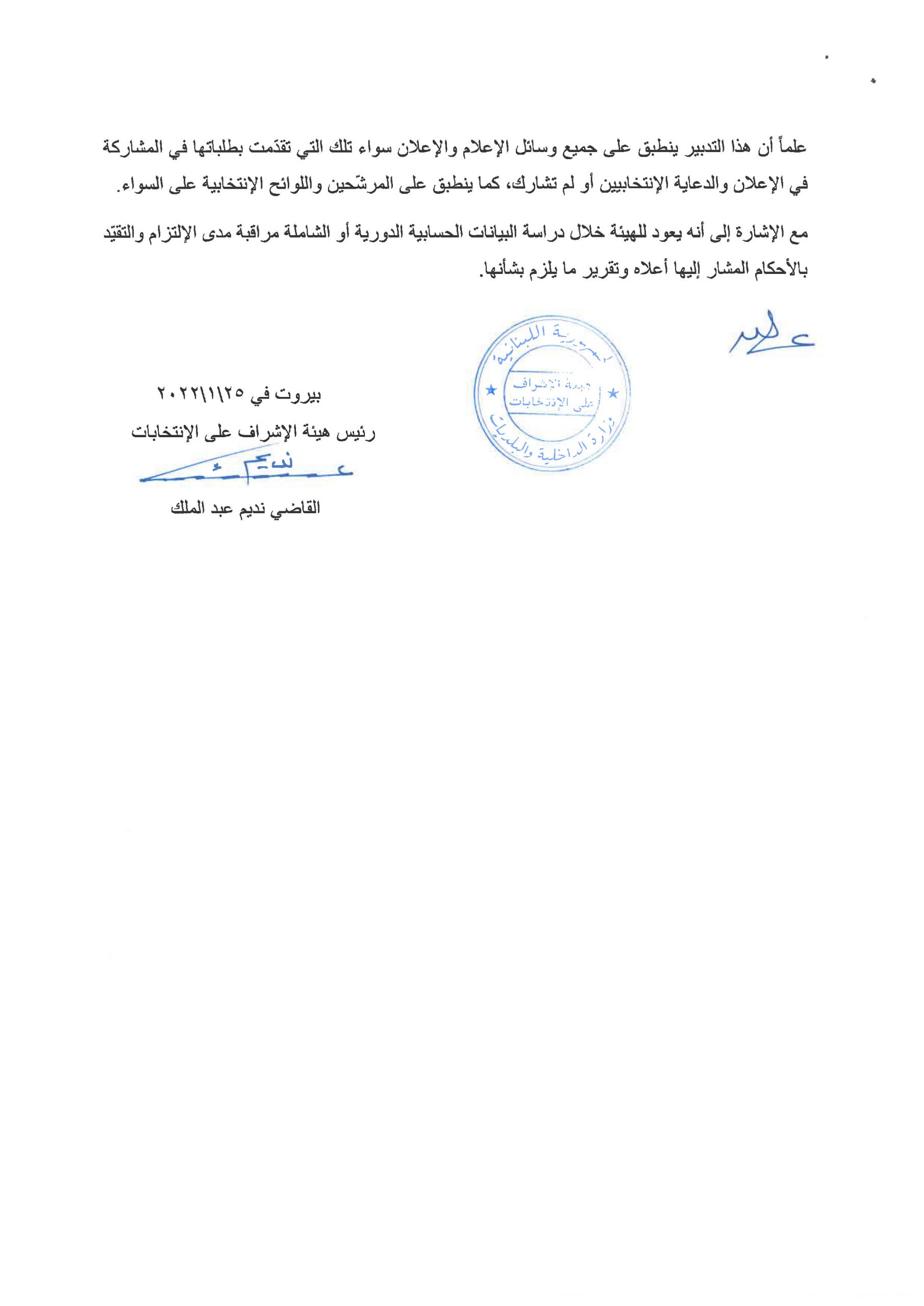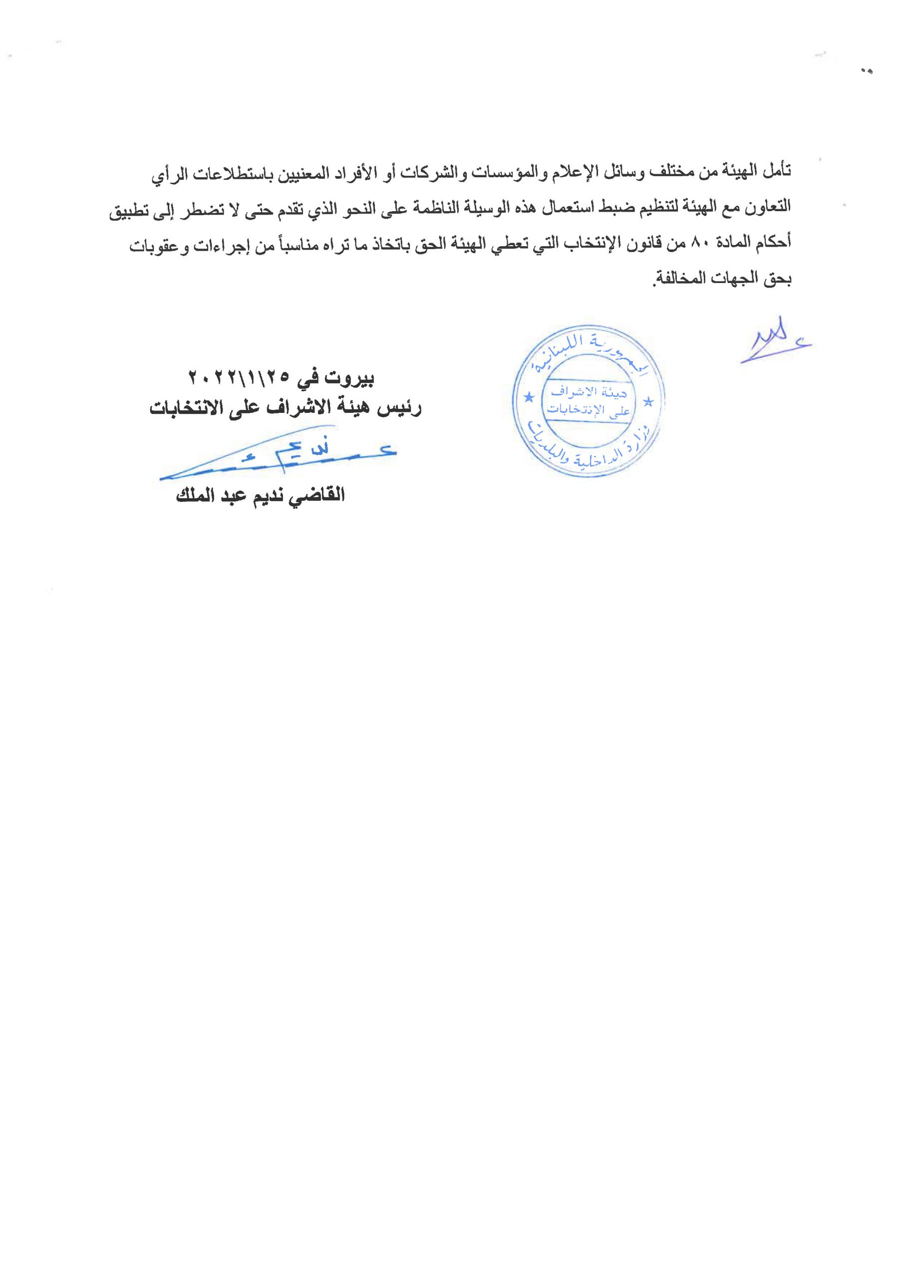 اصدرت هيئة الاشراف على الانتخابات، برئاسة رئيسها القاضي نديم عبد الملك، سلسلة بيانات وقرارات واعلانات تتعلق بانطلاقة عملها في الاشراف على الانتخابات النيابية المقبلة، واحتساب نفقات الدعاية والاعلانات للمرشحين واللوائح الانتخابية، وضبط ظاهرة استطلاعات الرأي على وسائل الاعلام، وتحديد المعايير للتمييز بين الاعلام الانتخابي والاعلان الانتخابي، وبالذين يستثمرون لوحات مخصصة للاعلانات الراغبة في المشاركة في الاعلان الانتخابي وتنظيم استعمالها.