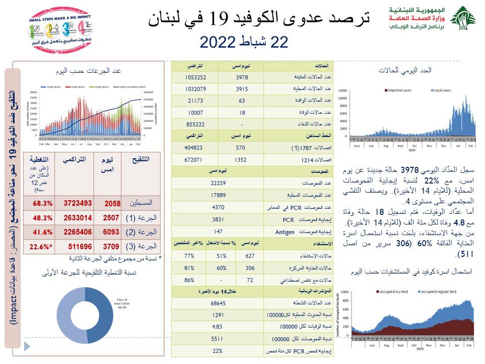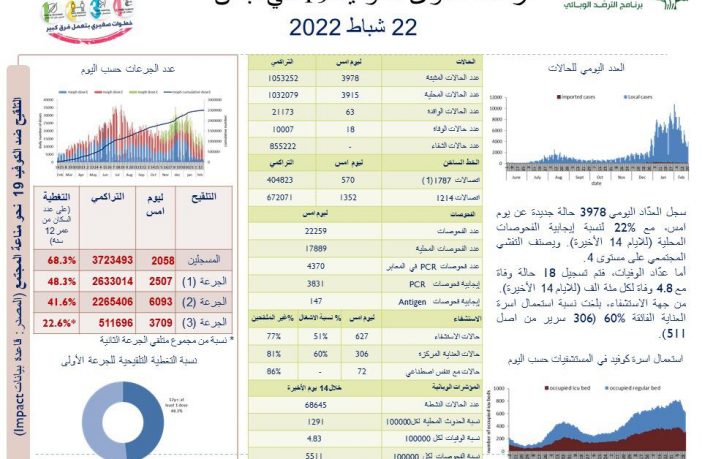 جائحة كورونا وزارة الصحة: تسجيل 3978 إصابة جديدة بفيروس كورونا و18 حالة وفاة By F.S فبراير 22, 2022 لا توجد تعليقات وزارة الصحة: تسجيل 3978 إصابة جديدة بفيروس كورونا و18 حالة وفاة