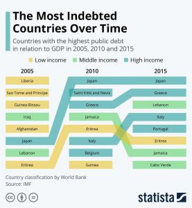 فيما شهد عام 2015، تغيراً جذرياً في القائمة لتنضم أربع دول مرتفعة الدخل وبلد واحد فقط من البلدان منخفضة الدخل على رأس قائمة الدول الأكثر مديونية؛ اليابان واليونان ولبنان وإيطاليا.