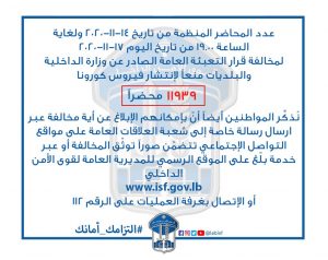 أخر الأخبار كم بلغ عدد محاضر مخالفات قرار التعبئة العامة حتى الساعة؟ By GH نوفمبر 17, 2020 لا توجد تعليقات أعلنت المديرية العامة لقوى الأمن الداخلي مجموع محاضر مخالفات قرار التعبئة العامة المنظمة إعتباراً من تاريخ 14-11-2020 ولغاية الساعة 19:00 من تاريخ اليوم 17-11-2020 منعاً لانتشار فيروس كورونا. وبلغ عدد المحاضر 11939.