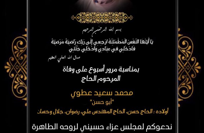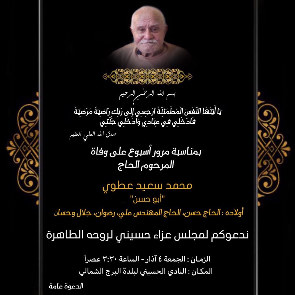 وفيات دعوة لإحياء اسبوع المرحوم الحاج محمد عطوي (أبو حسن) في البرج الشمالي By F.S مارس 3, 2022 لا توجد تعليقات عطوي
