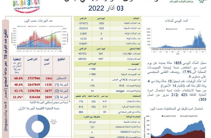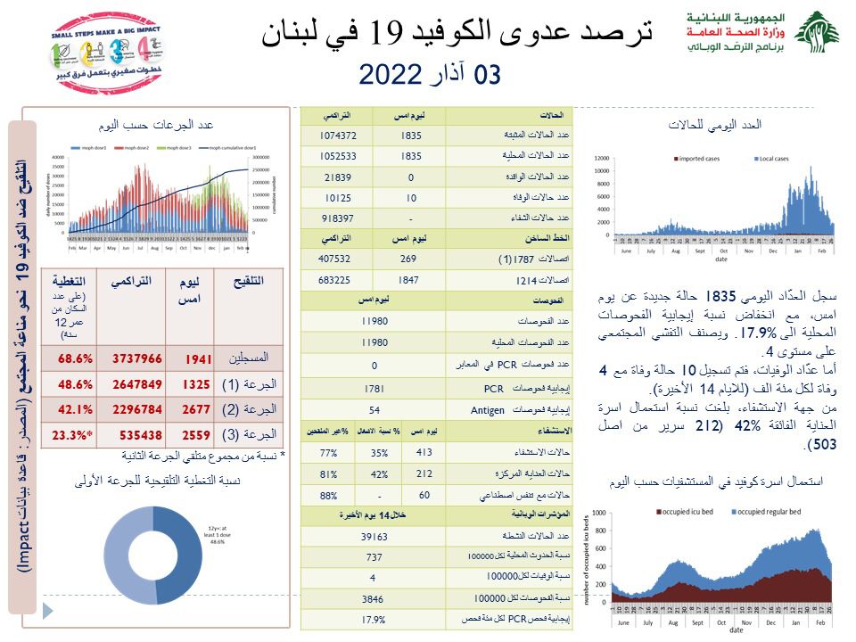 جائحة كورونا 1835 إصابة جديدة بفيروس كورونا و 10 حالات وفاة By AF مارس 3, 2022 لا توجد تعليقات 1835 إصابة جديدة بفيروس كورونا و 10 حالات وفاة كورونا لبنان