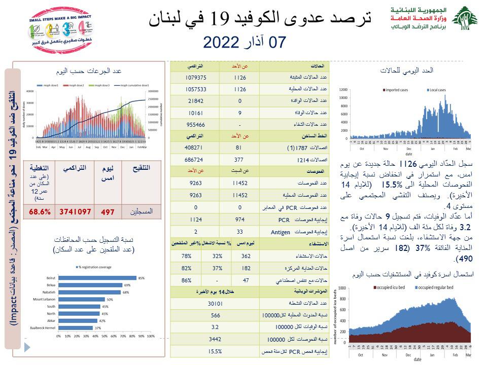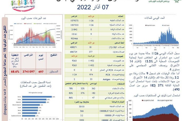 جائحة كورونا تسجيل 1126 إصابة جديدة و 9 حالات وفاة بفيروس كورونا By F.S مارس 7, 2022 لا توجد تعليقات كورونا لبنان