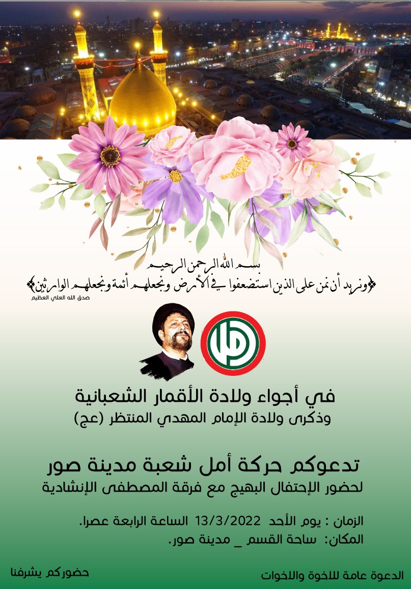 محليات حركة أمل تدعوكم للإحتفال بولادة الأقمار الشعبانية والإمام المهدي (عج) في صور By F.S مارس 10, 2022 لا توجد تعليقات تم الغاء المناسبة بسبب الأحوال الجوية حركة أمل