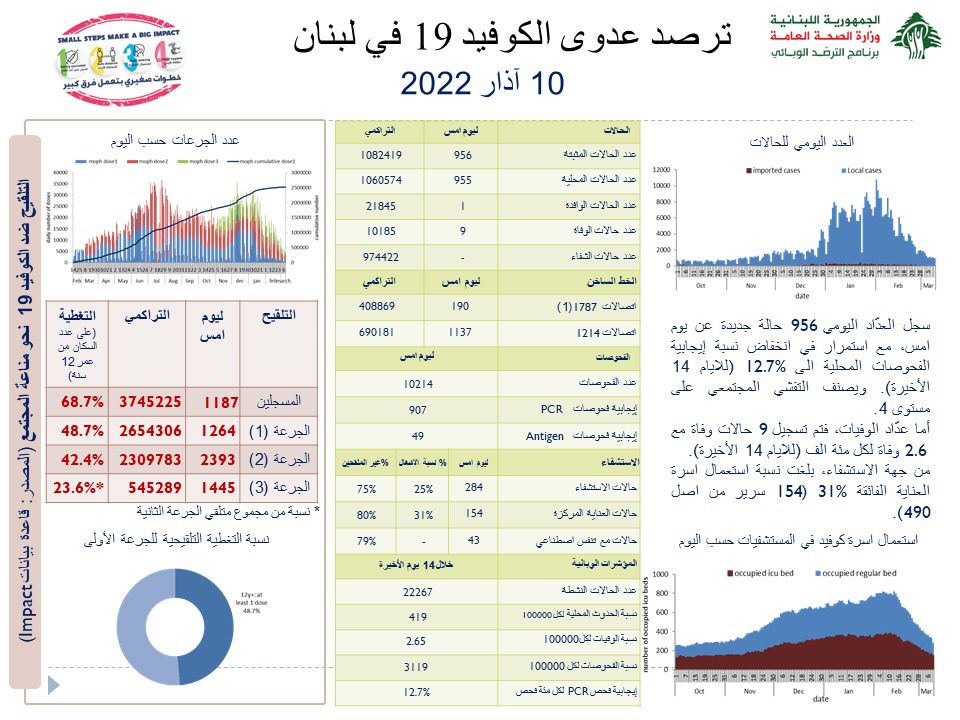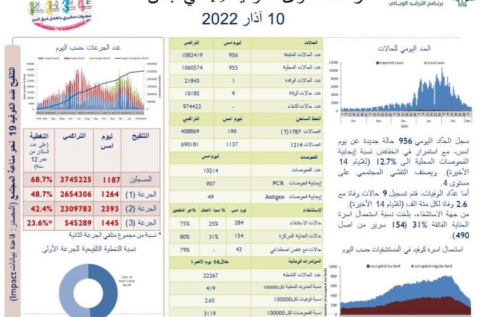 جائحة كورونا إصابات كورونا في لبنان دون الألف إصابة By F.S مارس 10, 2022 لا توجد تعليقات كورونا لبنان
