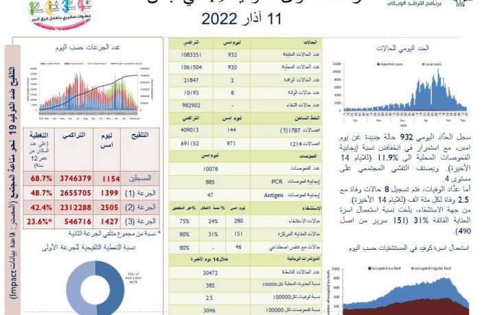 جائحة كورونا 932 إصابة جديدة بفيروس كورونا و 8 حالات وفاة By F.S مارس 11, 2022 لا توجد تعليقات كورونا لبنان