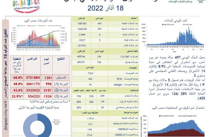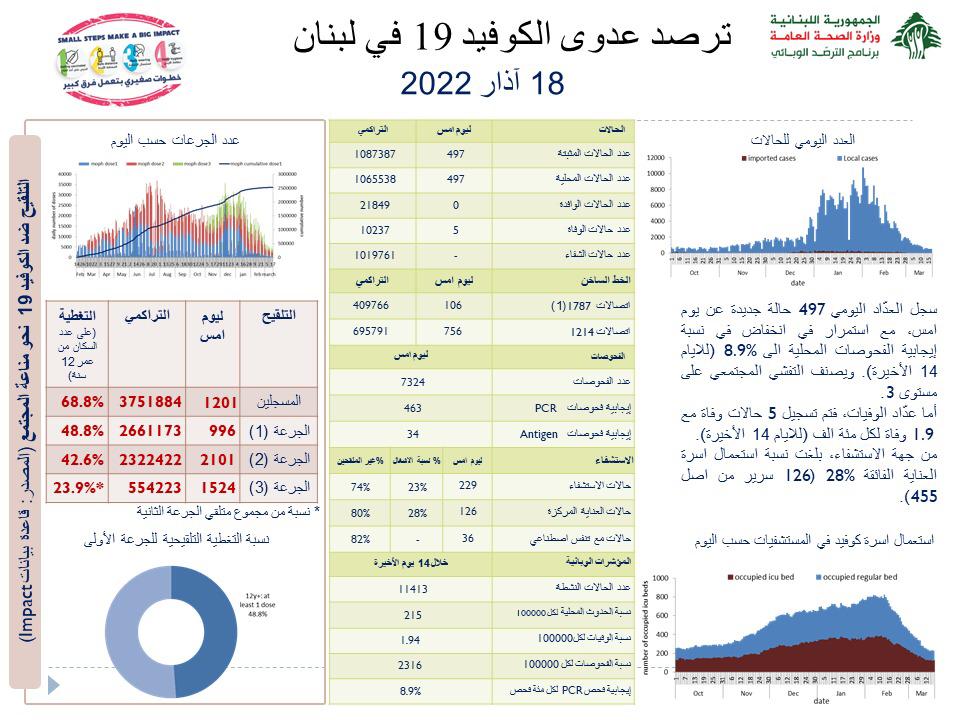 جائحة كورونا 497 إصابة جديدة بفيروس كورونا في لبنان و 5 حالات وفاة By AF مارس 18, 2022 لا توجد تعليقات 497 إصابة جديدة بفيروس كورونا في لبنان و 5 حالات وفاة أزمة كورونا
