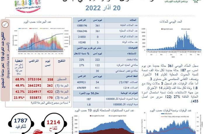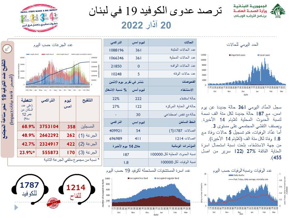 جائحة كورونا 361 إصابة جديدة بفيروس كورونا في لبنان و 5 حالات وفاة By F.S مارس 20, 2022 لا توجد تعليقات 361 إصابة جديدة بفيروس كورونا في لبنان و 5 حالات وفاة كورونا لبنان