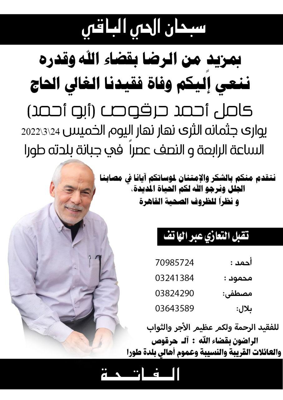 طورا: وفاة الحاج كامل حرقوص أبو احمد