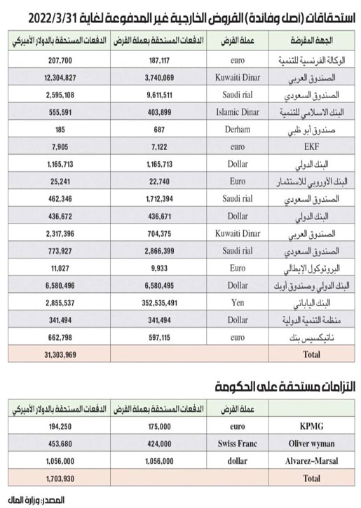 لما كانت هناك مستحقات قروض لصالح البنك الدولي لم يتم تسديدها بحيث قام بإرسال إشعار عبر البريد الإلكتروني بتاريخ 21/3/2022 يعلم الدولة اللبنانية بتداعيات التخلف عن تسديد مستحقاتها للبنك وذلك بعد مرور أكثر من 30 يوماً على استحقاق مبلغ 1165 مليون دولار أميركي استحقاق 15/2/2022، مع العلم بأنه إذا لم يتم التسديد خلال 45 يوماً من تاريخ الاستحقاق، لن يقوم البنك الدولي للإنشاء والتعمير بتحويل أي مبالغ إلى الحسابات المخصصة المنشأة بموجب أي قروض. كما يمكن للبنك أن يمتنع عن تحويل أي مبالغ إلى الحسابات المخصصة لبعض الهبات أو القروض المموّلة من الصناديق الائتمانية التي يديرها البنك. تجدر الإشارة إلى أن كافة القيود المطبّقة عند التخلف لمدة تزيد على 30 يوماً لتسديد أي دفعة تبقى سارية، وذلك لغاية تسديد كافة الدفعات المستحقة.