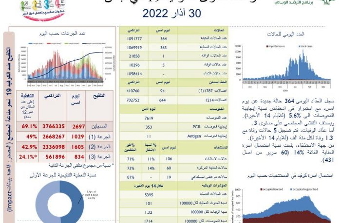جائحة كورونا 364 إصابة جديدة بفيروس كورونا و 5 حالات وفاة By AF مارس 30, 2022 لا توجد تعليقات 364 إصابة جديدة بفيروس كورونا و 5 حالات وفاة كورونا لبنان