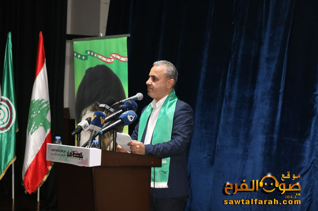 وأكمل: ” نحمل إليكم تحايا الرئيس نبيه بري ونجدد اليوم التزامنا بنهجه السياسي المبني على الإعتدال والحوار والمقاومة”.