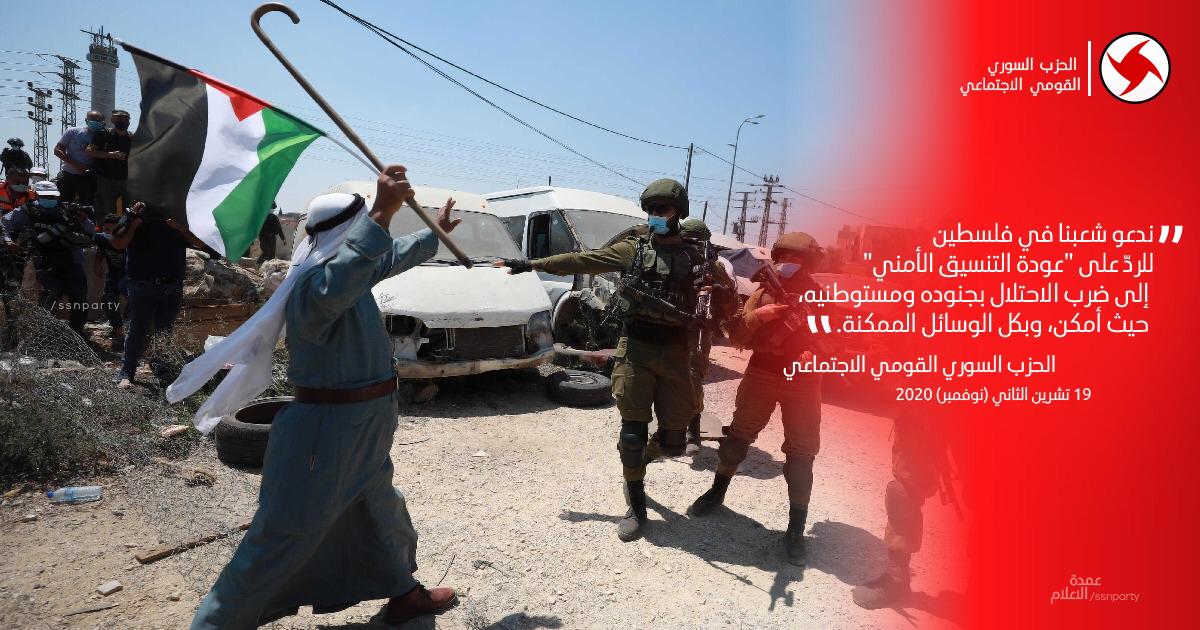 يدين الحزب السوري القومي الاجتماعي عودة “السلطة الفلسطينية” إلى ما يسمّى بالتنسيق الأمني مع الاحتلال الإسرائيلي، وهو الذي يهدف بالأساس إلى استخدام أجهزة السلطة لقمع أبناء شعبنا الفلسطيني، المصمّمين على مواجهة الاحتلال وضربه في #الضّفة_الغربية وفي الداخل المحتلّ.