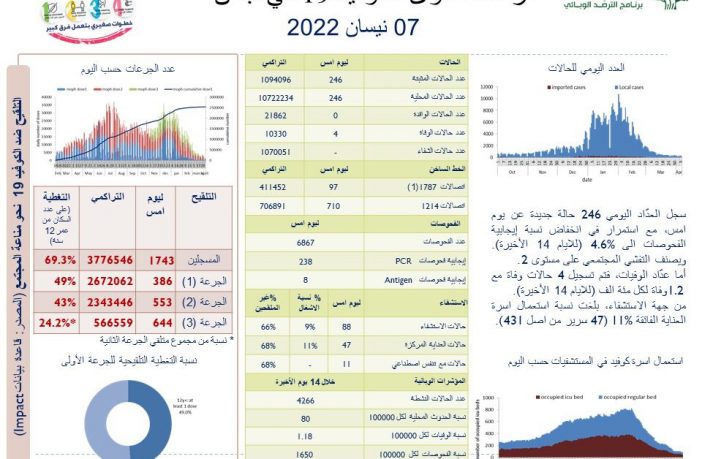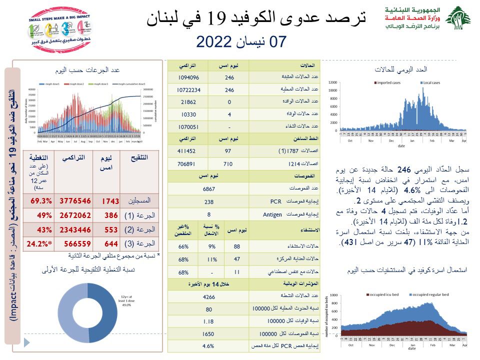 جائحة كورونا 246 إصابة جديدة بفيروس كورونا في لبنان و 4 حالات وفاة By F.S أبريل 7, 2022 لا توجد تعليقات 246 إصابة جديدة بفيروس كورونا في لبنان و 4 حالات وفاة كورونا لبنان