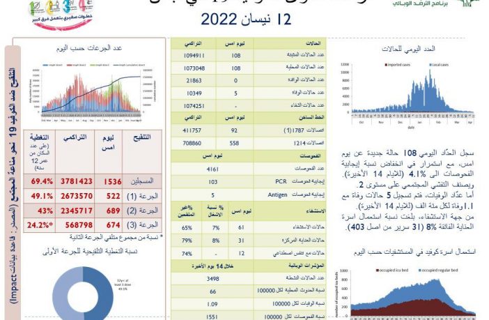 جائحة كورونا 108 إصابات جديدة بفيروس كورونا في لبنان و 5 حالات وفاة By F.S أبريل 12, 2022 لا توجد تعليقات 108 إصابات جديدة بفيروس كورونا في لبنان و 5 حالات وفاة كورونا لبنان