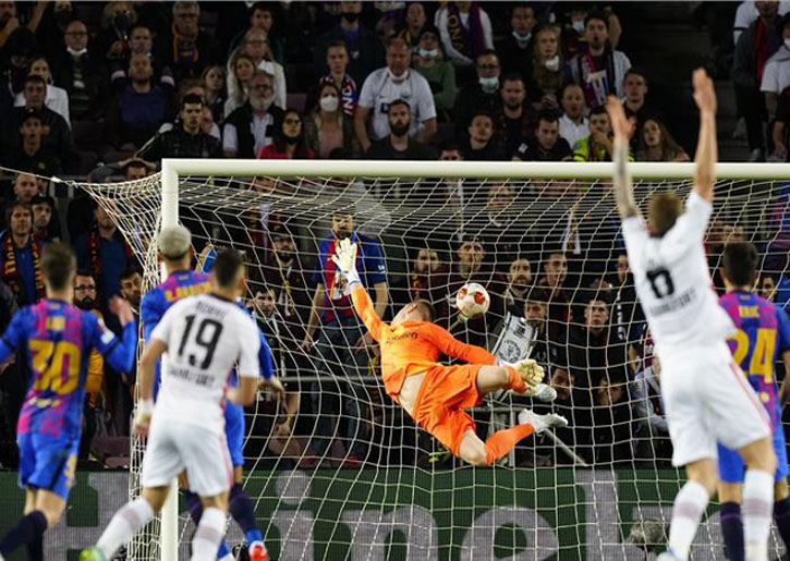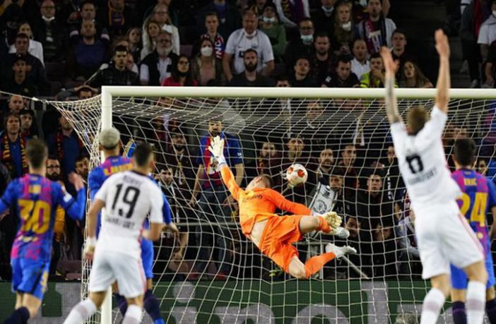 وتصدى تير شتيجن حارس مرمى برشلونة، لانفراد من ليندستورم لاعب فرانكفورت، الذي سدد كرة قوية أبعدها الحارس الألماني ببراعة في الدقيقة 58.