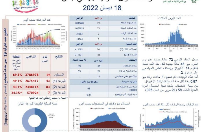 جائحة كورونا 72 إصابة جديدة بفيروس كورونا في لبنان و 3 حالات وفاة By F.S أبريل 18, 2022 لا توجد تعليقات 72 إصابة جديدة بفيروس كورونا في لبنان و 3 حالات وفاة كورونا لبنان