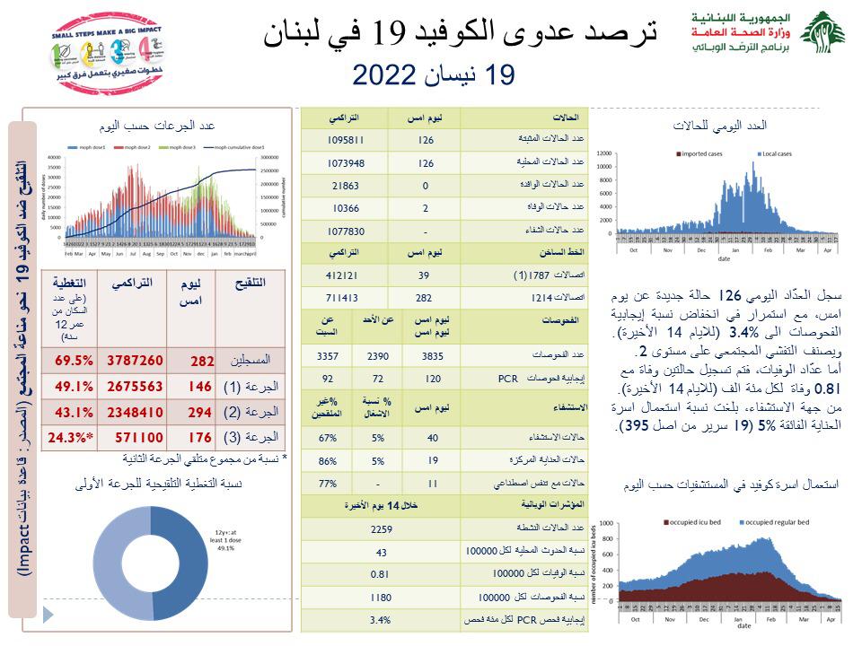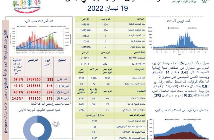 جائحة كورونا 126 إصابة جديدة بفيروس كورونا في لبنان و حالتا وفاة By F.S أبريل 19, 2022 لا توجد تعليقات كورونا لبنان