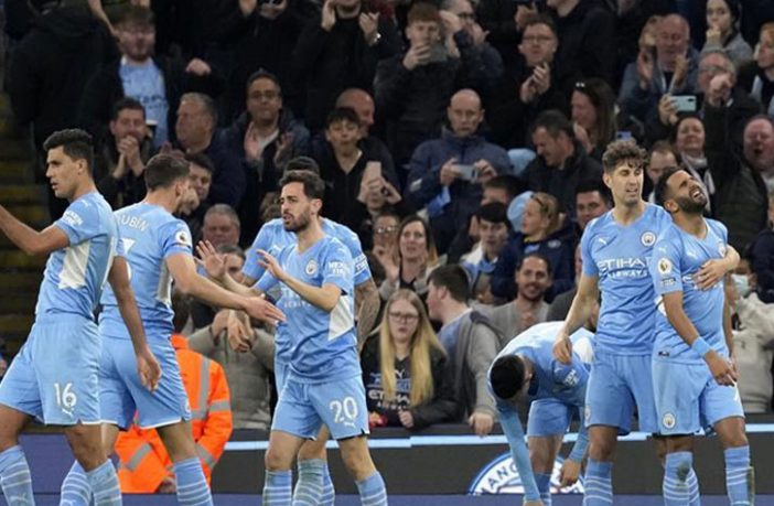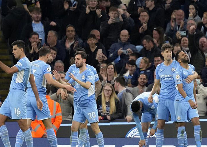 سجل ثلاثية المان سيتي، رياض محرز وفيل فودين وبيرناردو سيلفا في الدقائق 53 و65 و82.