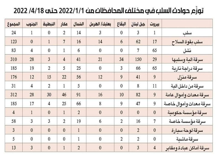 يستفيق اللبناني يوميًا على جرائم مروعة، آخرها مقتل وسرقة الصيدلانية ليلى رزق في محلة المروج-المتن الشمالي. وقبلها جريمة أنصار التي راحت ضحيتها امرأة وبناتها الثلاث. وأرقام الدولية للمعلومات تؤكد أن الأمن المجتمعي في خطر كبير. فقد ارتفعت جرائم السرقة في لبنان ما بين عامي 2019 و2021 بنسبة 270 في المئة. وجرائم القتل بنسبة 82 في المئة. وفي الأشهر الثلاثة من العام 2022 مقارنة بالفترة ذاتها من العام 2021، ارتفعت جرائم القتل بنسبة 15 في المئة والسرقة بنسبة 21 في المئة.