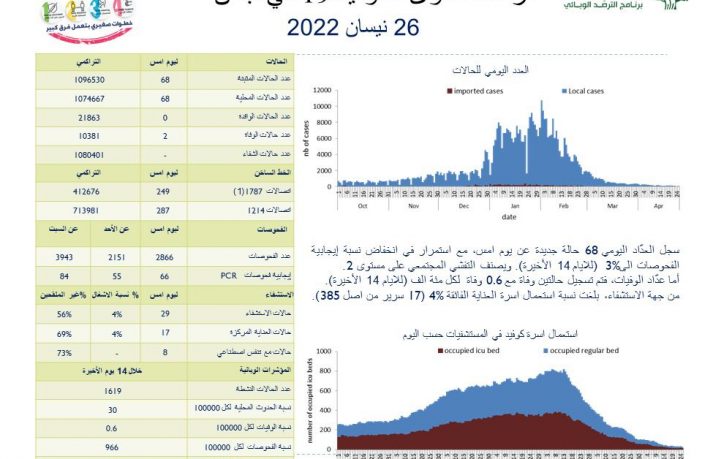 جائحة كورونا 68 إصابة جديدة بفيروس كورونا في لبنان وحالتا وفاة By AF أبريل 26, 2022 لا توجد تعليقات 68 إصابة جديدة بفيروس كورونا في لبنان وحالتا وفاة لبنان كورونا