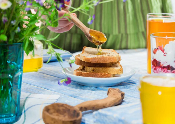 الفطور. قطعة من التوست الاسمر المحمص مع ملعقة متوسطة من العسل، قطعة صغيرة من الجبنة البيضاء قليلة الدسم، كوب من عصير البرتقال.