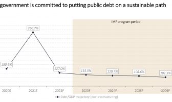 وتؤكد الحكومة انها في مرحلة إعادة هيكلة الديون، ستستمر في سداد مدفوعات خدمة الدين للشركاء متعددي الأطراف، وستقوم بالتفاوض مع حاملي السندات الاجنبية بهدف الوصول إلى اتفاق بشأن شروط إعادة الهيكلة، والتوصل الى اتفاق مع حاملي السندات على المبادئ الأساسية لإعادة الهيكلة والتوقيع على الشروط.