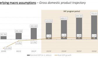 وفي توقعات الحكومة للوضع الاقتصادي خلال تنفيذ برنامج إنقاذ مع صندوق النقد الدولي على مدى 4 سنوات، مفترضة البدء بتطبيق البرنامج اوائل العام 2023، ارتفاع إجمالي الناتج المحلي الاسمي من 360,360 الف مليار ليرة في 2022 الى 520,058 الف مليار ليرة في 2023، والى 608,071 الف مليار ليرة في 2024، و684,584 الف مليار ليرة في 2025، وصولاً الى 756,651 الف مليار ليرة في 2026، مع نمو الناتج المحلي الإجمالي الحقيقي بنسبة 2,2 في المئة في 2023 و4,3 في المئة في 2024، و3,3 في المئة في 2025، و3,1 في المئة في 2026.