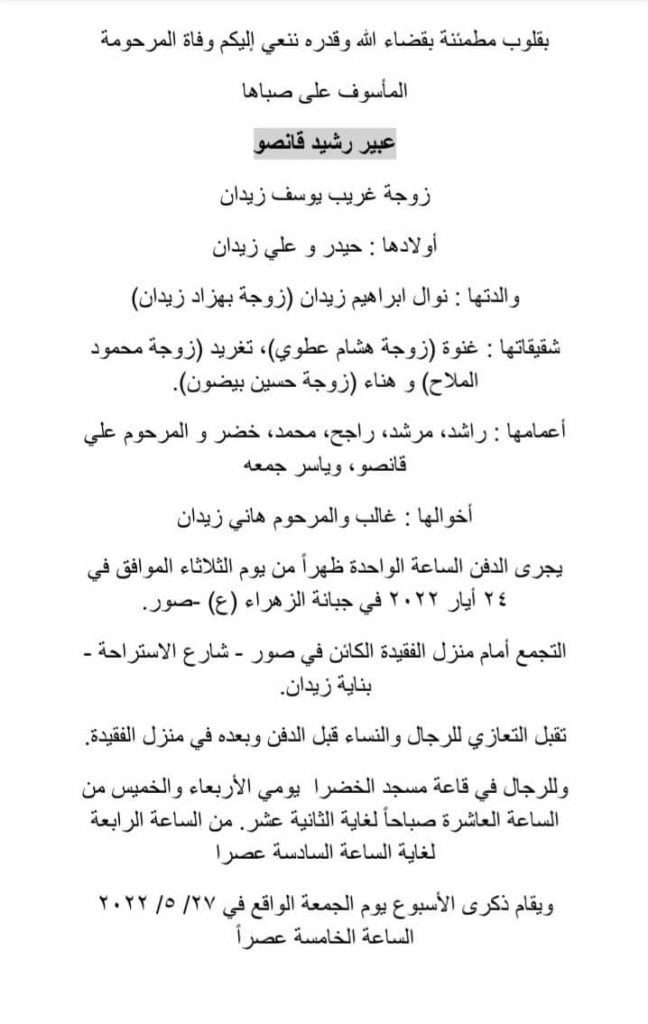 وفاة فقيدة الصبا عبير رشيد قانصو
