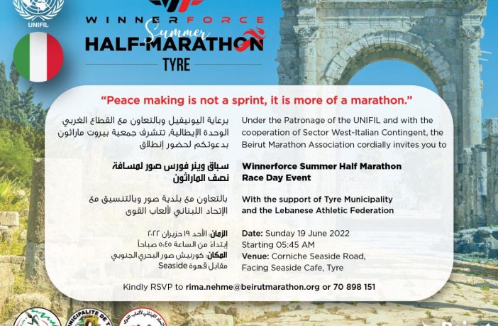 ستكون مدينة صور الضاربة جذورها في عمق التاريخ والأصالة على موعد جديد يوم الأحد 19 حزيران 2022 مع التألق والإبداع عندما تستضيف حدثاَ رياضياً متعدّد الأهداف والنواحي الإيجابية سياحياً وإقتصادياً وثقافياً وإجتماعياً وهو سباق ” وينر فورس نصف ماراثون صور” الذي تنظمه جمعية بيروت ماراثون برعاية القطاع الغربي في قوات اليونيفيل ( الوحدة االإيطالية ) وبالتعاون مع المجلس البلدي لمدينة صور .