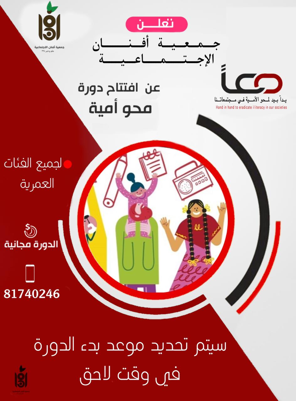 محليات جمعية أفنان الاجتماعية تعلن عن افتتاح دورة مجانية لمحو الأمية لجميع الفئات العمرية By F.S يونيو 19, 2022 لا توجد تعليقات جمعية أفنان
