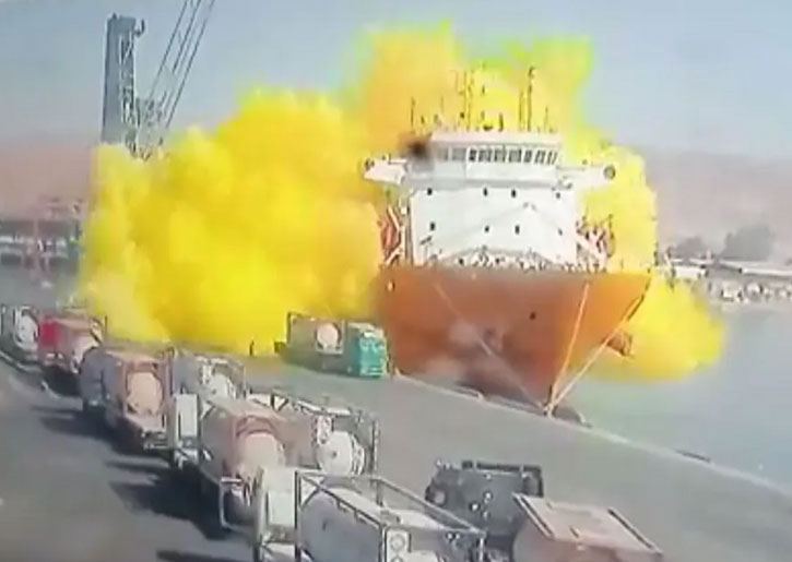 وبثت قناة “المملكة” الرسمية مقطع فيديو يُظهر لحظة سقوط الحاوية ووقوع انفجار كبير نتج عنه تسرب مادة غازية صفراء اللون امتدت لعشرات الأمتار.