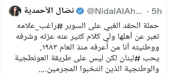كما دافعت نضال الاحمدية قائلة:”حملة الحقد الغبي على السوبر راغب علامه تعبر عن أهلها ولي كلام كثير عنه عزته وشرفه ووطنيته أنا من أعرفه منذ العام ١٩٨٣”. وأضافت:”راغب علامه لبناني متل كل لبناني يحمل أكثر من جنسية ومن واجبه أن يشكر رئيسه الجديد”.