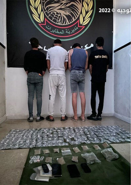 “بتاريخ 29 / 6 / 2022 أوقفت دورية من مديرية المخابرات في منطقة صحراء الشويفات المواطنين: (خ.غ) (م.ز) (م.ح) و(ح.ع) لإقدامهم على ترويج المخدّرات وتعاطيها. وضبطت بحوزتهم كمية منها (208 مظاريف من مادة الكوكايين، 11 كرة من حشيشة الكيف وكيسين من مادة الماريجوانا)، كما أن بحق (ح.ع) مذكرة توقيف بجرم إطلاق النار.