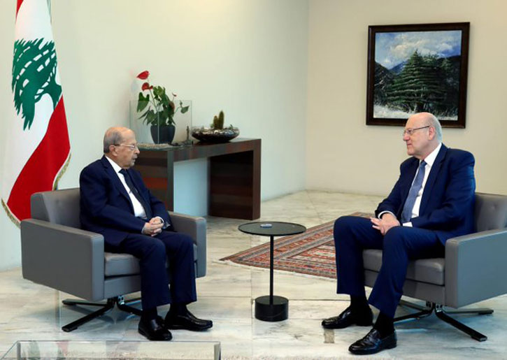 وزار ميقاتي صباح أمس القصر الرئاسي، حيث التقى الرئيس عون وأطلعه على نتائج الاستشارات النيابية التي أجراها، وقدم له صيغة للحكومة التي يقترحها. وقد أبلغ رئيس الجمهورية الرئيس المكلف أنه سيدرس هذه الصيغة ويبدي رأيه فيها، بحسب بيان الرئاسة.