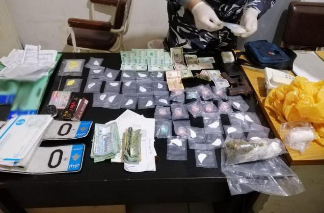 ضُبط في داخل سيّارة المشتبه بهما بترويج المخدرات /49/ ظرفاً من مادتي الكوكايين وباز كوكايين معدّة للترويج، إضافةً إلى كمية من حشيشة الكيف والماريجوانا، مسدس حربي عيار /9/ ملم. دفتر ورق لف سجائر، ومبلغ /2217000/ ل. ل. و /195/ دولاراً أميركياً، و/3/ لوحات سيّارات اثنتان منهما خصوصية وثالثة مخصصة لتأجير السيارات.