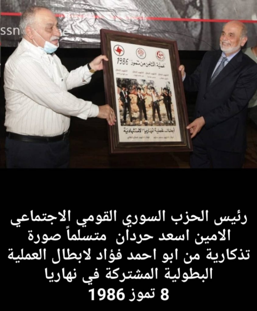 وفي نهاية الاحتفال تسلم حردان صورة من أبو أحمد فؤاد لأبطال عملية نهاريا المشتركة 1986.