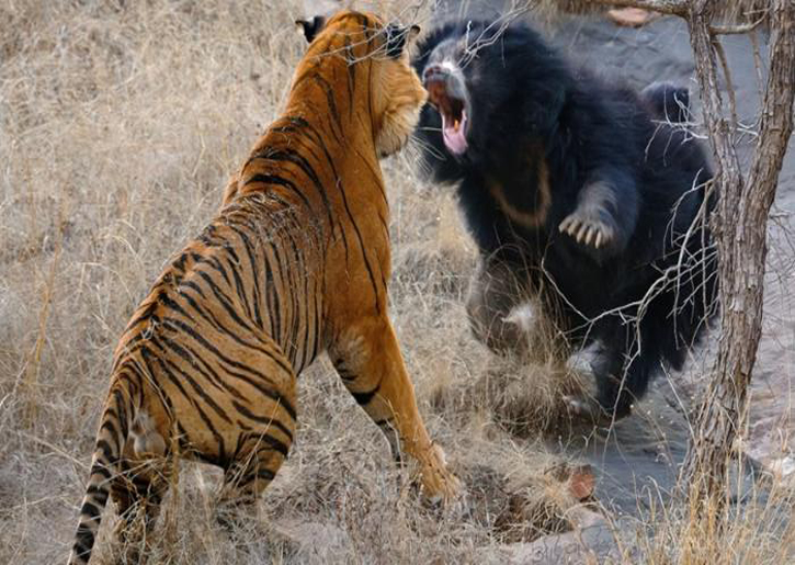 وكما يظهر في تسجيل مصور للمعركة التي لم يُحدد تاريخها، شوهد النمر البنغالي وهو يطرح الدب الكسلان أرضا، وكانت له الغلبة مؤقتًا، حتى اعتقد المارة أن الدب سيموت في المعركة.