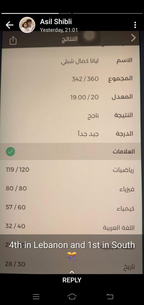 مبروك للطالبة ليانا كمال شبلي نجاحها في الامتحانات الرسمية فرع علوم عامة ونيلها الدرجة الاولى في الجنوب والرابعة على صعيد لبنان.