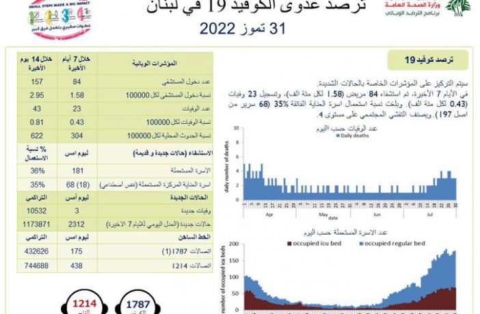 أعلنت وزارة الصحة العامة عن تسجيل 2312 إصابة جديدة بفيروس كورونا يرفع العدد التراكمي للحالات المثبتة إلى 1173871.