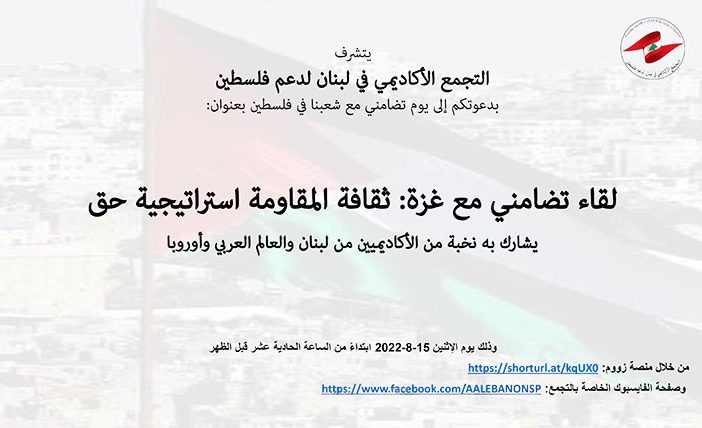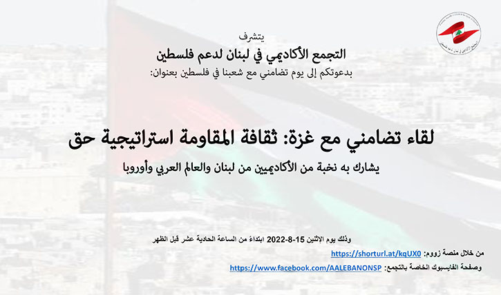ينظّم “التجمّع الاكاديمي في لبنان لدعم فلسطين” لقاء تضامنيا مع غزة،بعنوان “ثقافة المقاومة استراتيجية حق”.
