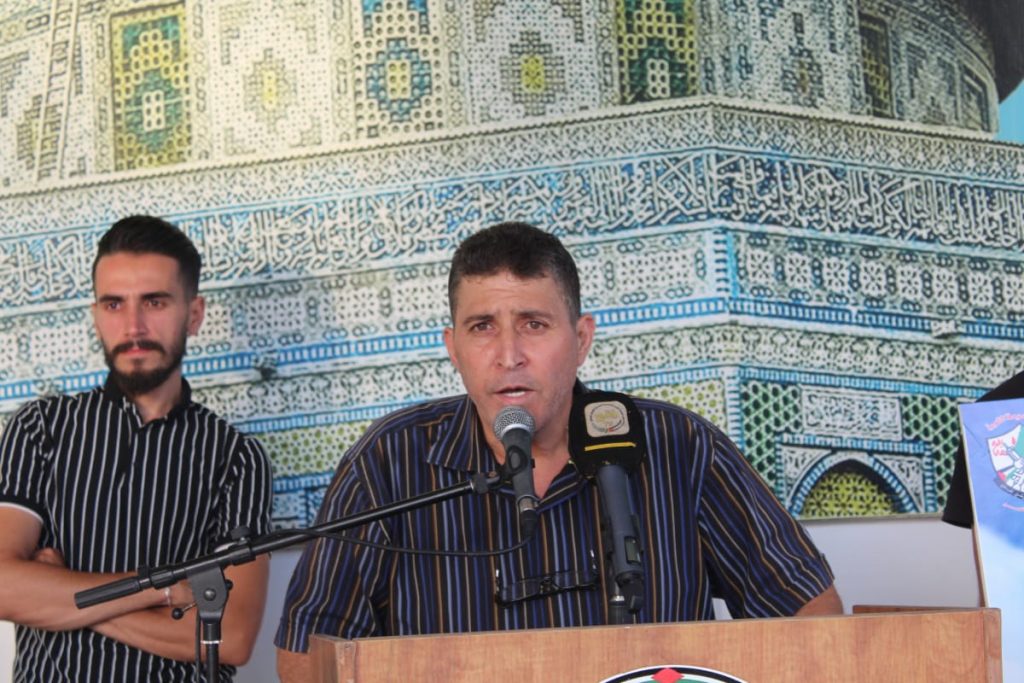 من هنا من هذا المخيم الصامد الذي ذاق ويلات الإحتلال من قصف الزوارق والقصف المدفعي والجرف الكامل في الإجتياح نجدد العهد والبيعة لقيادتنا الحكيمة الصادقة ونبعث بخالص التحيات إلى حامل الأمانة الصلب المقدام سيادة الرئيس محمود عباس أبو مازن وإخوانه في اللجنة المركزية والمجلس الثوري لحركتنا العظيمة فتح ونقول لهم سيروا على بركة الله فنحن معكم ولن نترككم ويدنا دائما دائما على الزناد ولن نترك السلاح.