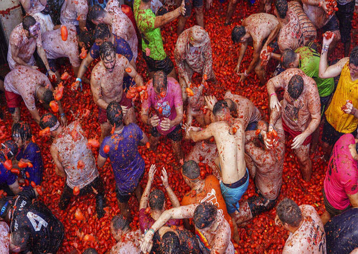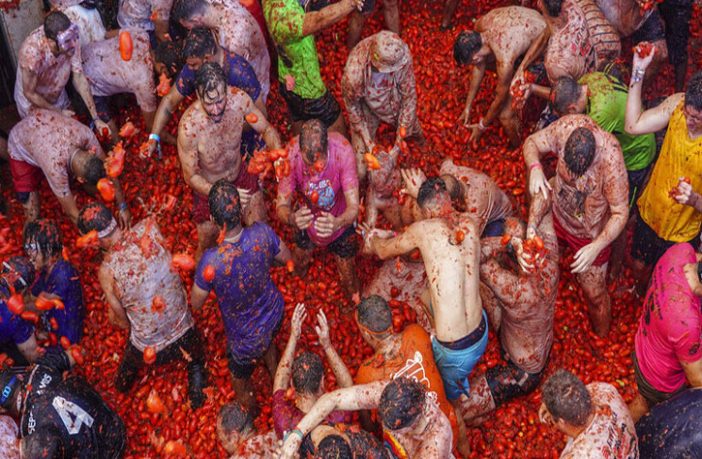 قام مواطنون من جميع أنحاء العالم بضرب بعضهم البعض بالطماطم، حيث انطلق عراك الطماطم الشهير في إسبانيا “لا توماتينا” اليوم الأربعاء بعد توقف لمدة عامين بسبب جائحة فيروس كورونا.