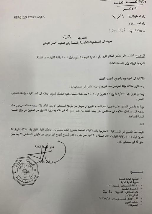 أصدر وزير الصحة العامة في حكومة تصريف الاعمال فراس أبيض تعميماً حمل الرقم 29، موجهاً إلى المستشفيات الحكومية والخاصة والصليب الاحمر، شدد على ضرورة عدم السماح بخروج أيّ مريض من طوارىء المستشفى إلاّ بعد تأمين سرير له في مستشفى آخر.