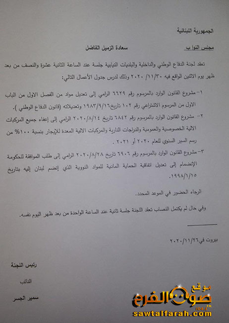 محليات جلسة للجنة الدفاع الوطني والداخلية والبلديات النيابية يوم الإثنين.. هل تُعفى المركبات من الرسم السنوي؟ By F.S نوفمبر 28, 2020 لا توجد تعليقات دعا رئيس لجنة الدفاع الوطني والداخلية والبلديات النيابية النائب سمير الجسر الى جلسة عند الساعة الثانية عشرة والنص من بعد ظهر يوم الإثنين الواقع فيه 30/11/2020