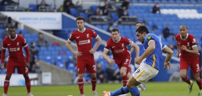 وتحصل برايتون على ركلة جزاء في الدقيقة الثانية من الوقت بدل الضائع بعد الرجوع إلى تقنية الفار، بعدما سدد روبرتسون قدم ويلبيك بدلًا من الكرة.