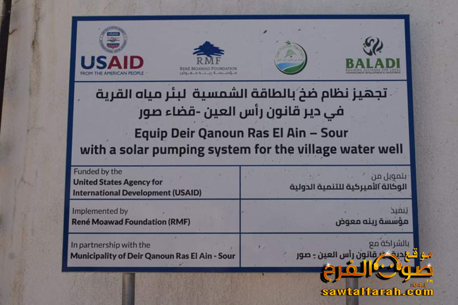 يتقدم رئيس بلدية دير قانون رأس العين وأعضاء المجلس البلدي وأهالي بلدة دير قانون رأس العين من مؤسسة رينة معوض بجزيل الشكر والامتنان على تجهيزهم نظام ضخ بالطاقة الشمسية للبئر الارتوازي في البلدة بتمويل من الوكالة الامريكية الدولية ضمن برنامح بلدي .