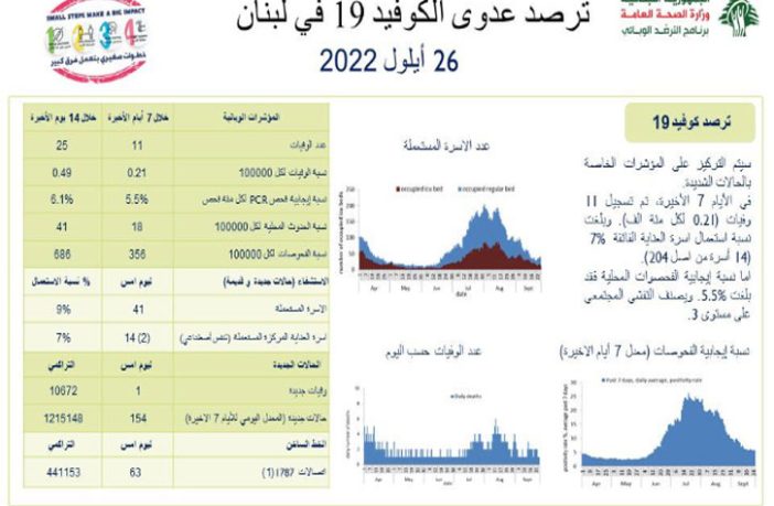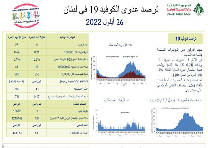 أعلنت وزارة الصحة العامة في تقريرها اليومي تسجيل 154 إصابة جديدة بفيروس كورونا رفعت العدد التراكمي للحالات المثبتة إلى 1215148، كما تم تسجيل حالة وفاة واحدة.